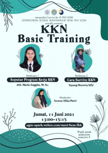 Kementrian Sosial Masyarakat BEM FKH UGM telah melaksanakan kegiatan KKN Basic Training pada hari Jumat, 11 Juni 2021 sebagai bentuk pelayanan dari BEM terhadap mahasiswa FKH UGM angakatan tahun 2018 dengan acara yang berisikan pemaparan materi kedokteran hewan yang terkait dengan KKN, kiat-kiat persiapan KKN bersama dosen FKH UGM drh. Marla Anggita, M. Sc. beserta kisah pengalaman dalam menjalankan program kerja KKN dari mahasiswa yang telah menjalani KKN Yayang Morovia Sifa’ pada tahun sebelumnya. Kegiatan ini dilaksanakan mulai pukul 13.00 hingga 15.15 menggunakan media aplikasi Webex Meeting.
