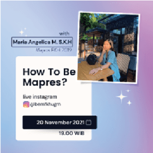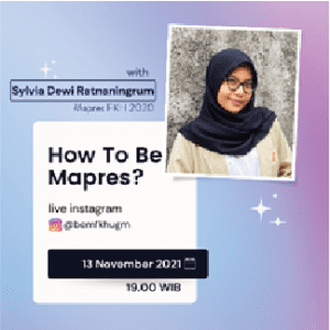 Pada tanggal 13 dan 20 November 2021, BEM FKH UGM melaksanakan PILMAPRES : Bincang Mapres 2021. Kegiatan ini membahas tentang tips dan dan trik dalam menghadapi PILMAPRES 2021. Dalam masa PILMAPRES 2021, kegiatan ini diharapkan dapat membantu pemahaman mahasiswa dalam mengikuti proses pemilihan mahasiswa berprestasi serta memberikan motivasi dan menarik minat mahasiswa FKH UGM untuk mengembangkan potensi dalam diri mereka dalam mengikuti pemilihan mahasiswa berprestasi.