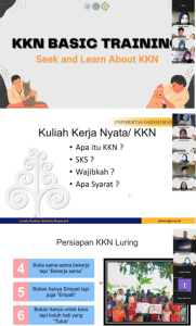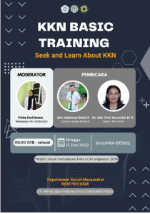 Pada hari Minggu 12 Juni 2022, Departemen Sosial Masyarakat BEM FKH UGM telah melaksanakan kegiatan KKN-Basic Training sebagai bentuk pelayanan dari BEM terhadap mahasiswa FKH UGM angkatan tahun 2019 yang akan mengikuti KKN pada periode 2. Kegiatan tersebut dikemas dalam bentuk pembekalan dan sharing pengalaman yang mencakup pemaparan materi program kerja terkait dengan pelaksanaan KKN terutama untuk mahasiswa fakultas kedokteran hewan oleh Dr. drh. Trini Susmiati, M.P., serta sharing kisah dan pengalaman dalam menjalankan program kerja KKN secara luring oleh drh. Hadimas Bakti Pratama. Kegiatan ini dilaksanakan mulai pukul 09.00 hingga 12.00 WIB menggunakan platform Zoom Meeting.