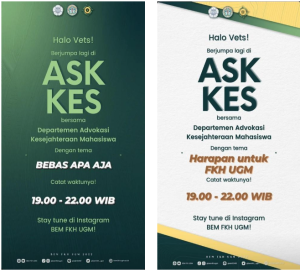 ASK KES merupakan salah satu pergerakan dari Departemen Advokasi dan Kesejahteraan Mahasiswa yang bertujuan untuk membantu menampung permasalahan dan menjawab pertanyaan tersebut sesuai wewenang dan ranah advokasi. Bentuk kegiatan dari ASK KES berupa pengadaan tanya jawab dari mahasiswa kepada Departemen Advokasi Kesejahteraan Mahasiswa melalui question box melalui Instagram BEM FKH UGM berdasarkan tema yang telah disediakan oleh PJ ASK KES sebagai admin pada hari Jumat pukul 19.00 – 22.00 WIB setiap dua minggu sekali. Output berupa jawaban yang dibagikan melalui story Instagram BEM FKH UGM.